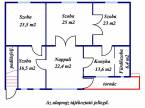 Helyiségei: nappali, 3 utcára néző szoba, egy udvarra néző szoba, konyha, fürdőszoba, ez a lakórész 130,4 m2, a nappaliba egy kis tornácon keresztül jutunk.