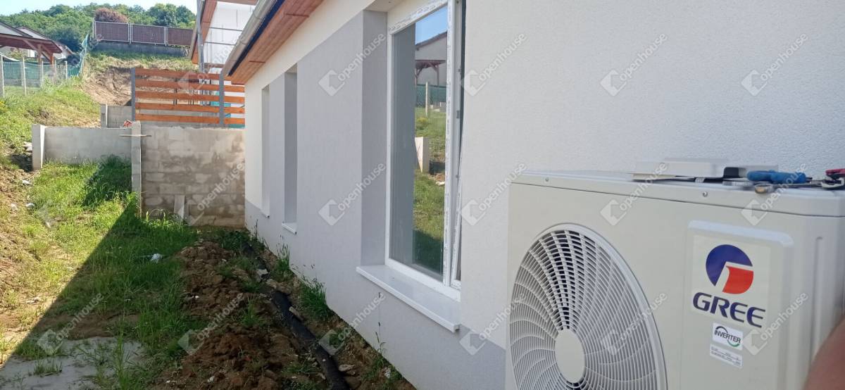 A ház 30 cm-es Porotherm téglából épül, 15 cm vastag külső hőszigeteléssel, antracit színű tetőcserepekkel. A szigetelt, könnyűszerkezetes födém tovább növeli az energiahatékonyságot. A fűtésről és hűtésről modern levegő–levegő rendszerű hőszivattyú gondoskodik, helyiségenkénti egyedi szabályozással, amely rendkívül gazdaságos és kényelmes megoldást kínál. A meleg vizet hőtárolós, okos Ariston hőszivattyús villanybojler biztosítja, minimális energiafelhasználás mellett.