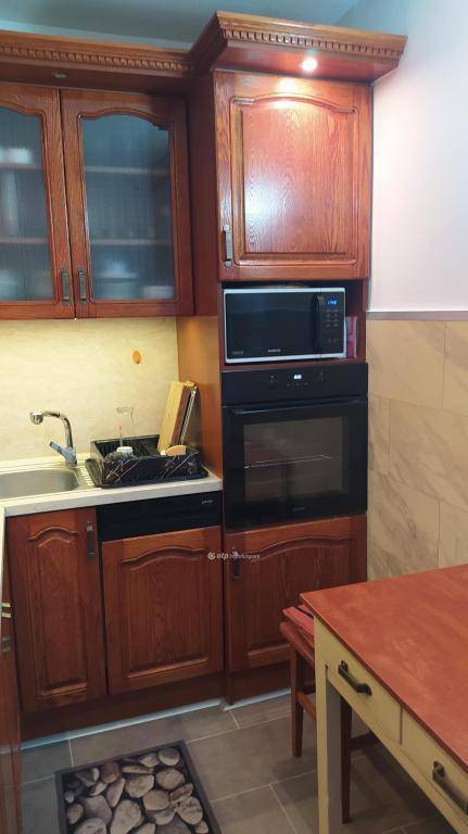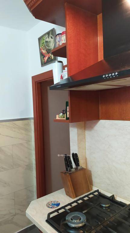 A bejárati ajtó borovi fenyőből van. A belső ajtók borovi fenyőből vannak. A konyhabútor, felülete cseresznyefából, a korpusz része bútorlapból van. A konyhai gépek is prémium minőségűek.