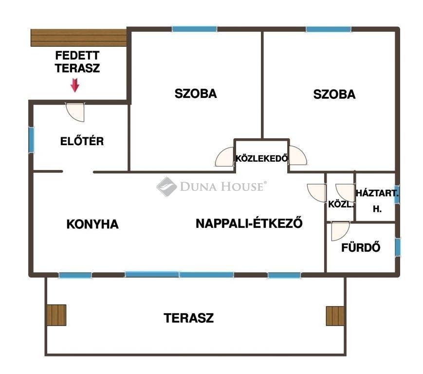 Az egész házra jellemző a praktikus elosztás és kihasználás. Az ingatlanba belépve egy igényesen kialakított előszobát, egy különleges tervezéssel, minőségi anyagokból készült amerikai konyha-étkezőt, és egy nappalit pillanthatunk meg. A nappaliból egy hangulatos, tágas, 35m2-es teraszra léphetünk át. A ház további két különnyíló szobával, fürdőszobával és tárolóval rendelkezik.