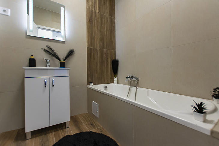 A lakás frissen felújított, igényes anyagokkal, letisztult, mégis karakteres dizájnnal. A tágas nappali és a konyha egy légteret alkotnak, így kellemes, otthonos tér jött létre. A fürdő és a WC külön helyiségben található, ami tovább növeli a kényelmet és praktikusságot.
