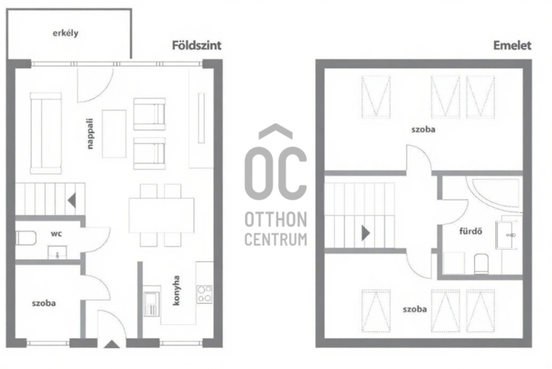 Az alsó szinten helyezkedik el a nappali, konyha, egy félszoba, és wc- mosdóval, a felső szinten pedig két különnyíló szoba, fürdő-wc.