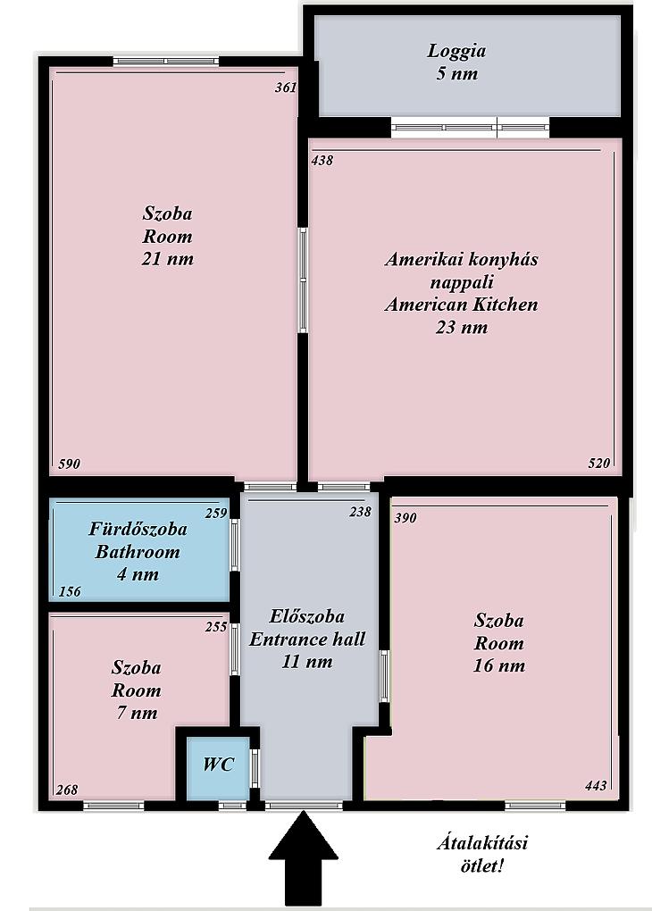 - Elosztás: jelenleg 2,5 különnyíló szoba, konyha, fürdő, külön WC