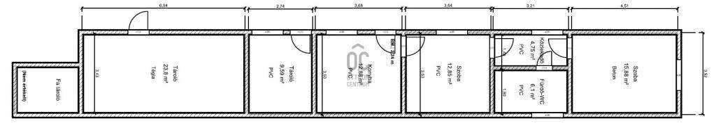 - két hálószoba, konyha + étkező, közlekedő, fürdő + WC, tároló helyiségekből áll