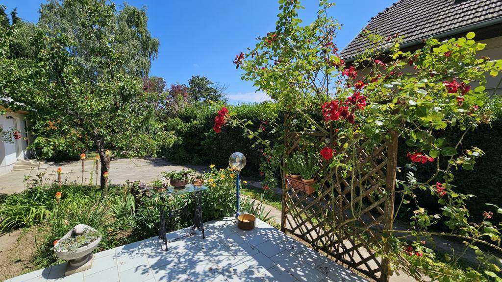 A gondosan kialakított udvart gyümölcsfák, rózsák és nagy árnyékot adó fák díszítik, intim, nyugodt hangulatot teremtve.