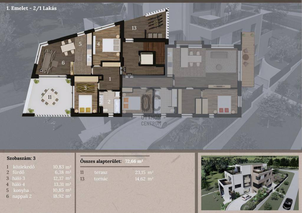 A lakásokhoz nagy méretű teraszok és fedett teraszok tartoznak, szinte teljes körpanorámával, csendes, zöldövezeti környezetben. Ideális választás két generáció együttélésére, otthon + iroda kialakítására, vagy értékálló befektetésként.