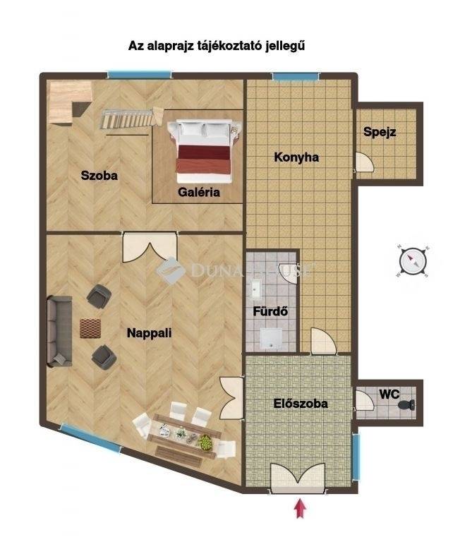 A lakás világos és tágas, a nappali 20 m2, a másik szoba galériázott, így a tér kihasználása kiváló.