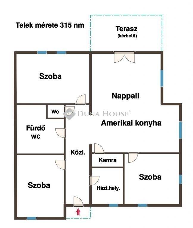 Az ingatlan amerikai konyhás nappalival, három külön nyíló szobával és saját, 315 m²-es saroktelekkel rendelkezik.