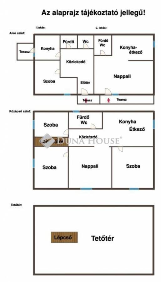 Alsó szint: két külön bejáratú, egyenként közel 45 m²-es, teraszos lakrész, önálló használatra vagy kiadásra alkalmas kialakítással