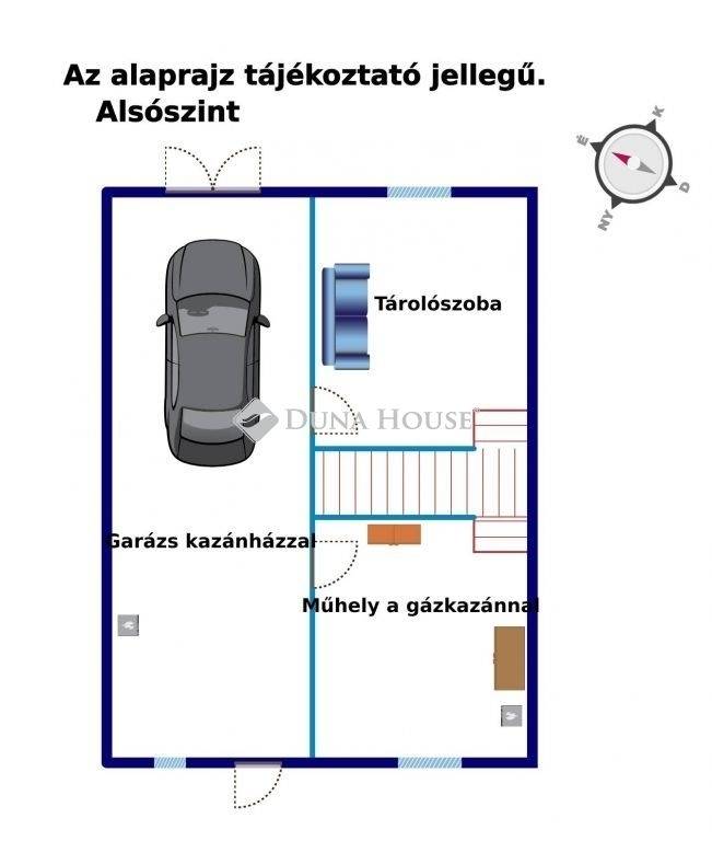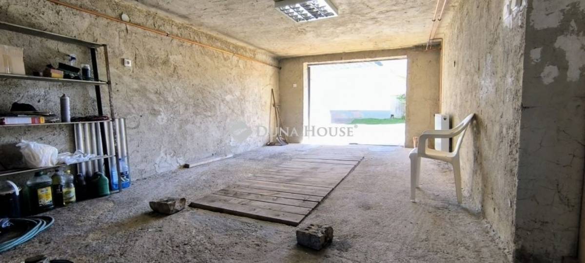 A két szintes ingatlan szuterén-szintjén aknás garázs, háztartási helyiség, tárolónak használt szoba, előtér található.