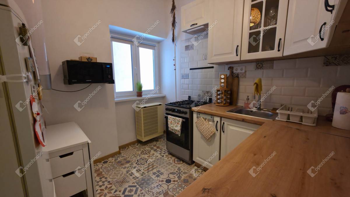 - a vizes helyiségek új szanitereket, burkolatokat kaptak, a fürdőszobában zuhanykabin és törölközőszárító, a konyhában új konyhabútor beépített mosogatóval van