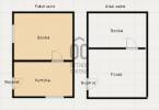 Felső szinten található a konyha és a szoba, alsó szinten a fürdőszoba és egy kis méretű helység.