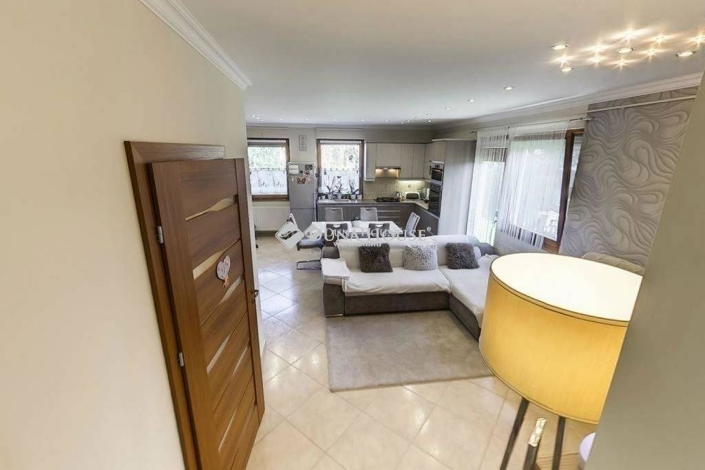 Némi szintkülönbséggel található egy kisebb szoba, gardróbszoba, valamint fürdőszoba (1 éve felújítva) , ezáltal akár teljesen el lehet szeparálódni a társassági lakótértől. A lakrész nagyon hangulatos és világos, nappalijából kijárat nyílik a szép parkosított kertjébe.