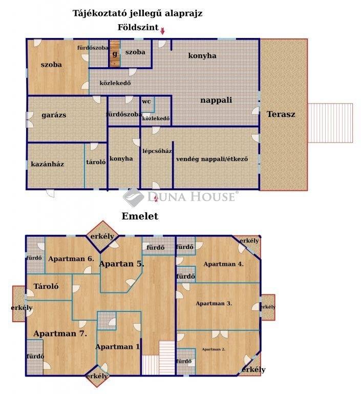 - az emeleten található egy tároló helyiség, mely mosókonyhaként funkcionál, 7 db apartman, melyek mind saját fürdőszobával rendelkeznek, illetve egy szoba kivételével mind rendelkezik saját erkéllyel