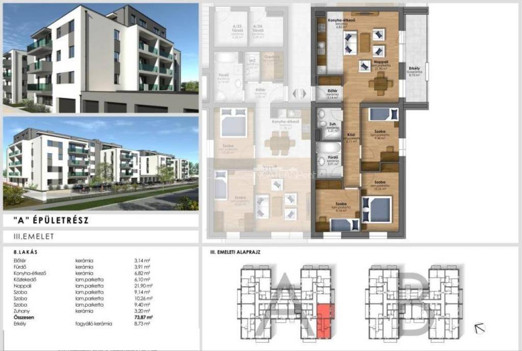 A hirdetésben szereplő 50 lakásos liftes A. jelű társasház lakásának paraméterei: