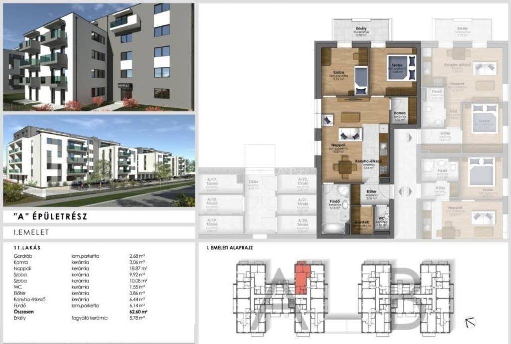 A hirdetésben szereplő 50 lakásos liftes A. jelű társasház lakásának paraméterei: