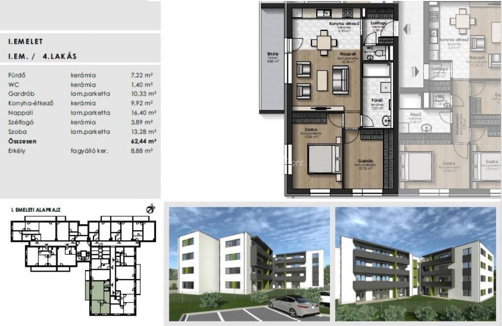 A hirdetésben szereplő III. emeleti D-i tájolású lakás paraméterei: