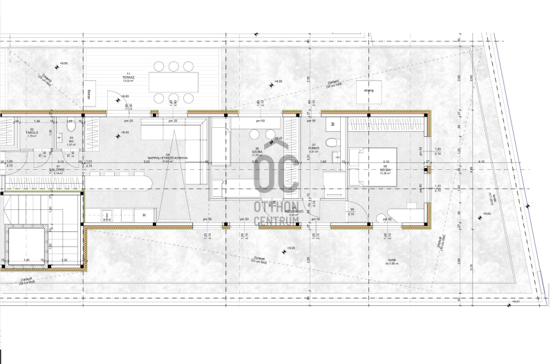 Ez az 3. emeleti penthouse lakás 65,54 nm-es, nappali-étkező-konyha +2 szobás, 13 nm-es terasszal.