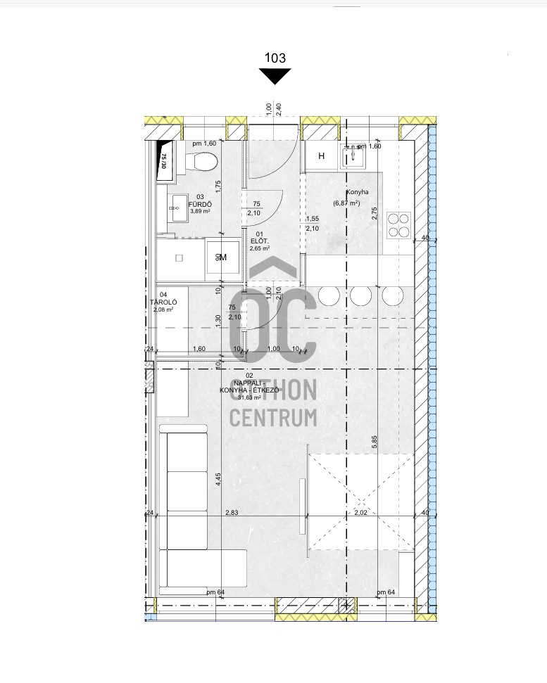 Ez az 1. emeleti lakás 40,25 nm-es, nappali-étkező-konyhás.