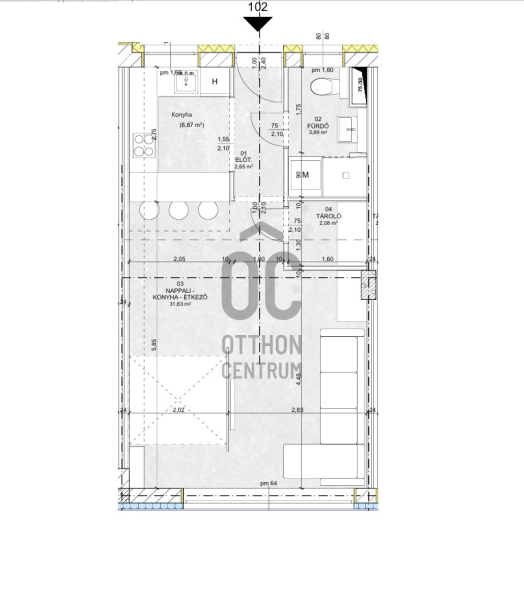 Ez az 1. emeleti lakás 40,25 nm-es, nappali-étkező- amerikai konyhás.