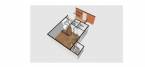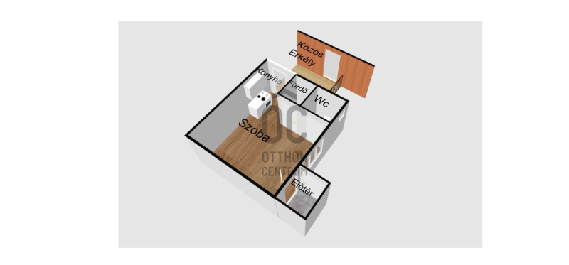 A lakás mérete 14,24m²-es + 7,2m2 közös erkélyes, elrendezése: előtér, konyha, fürdő, wc és egy szoba.