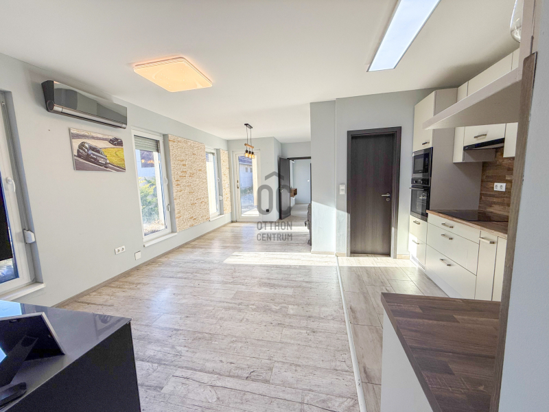 - Világos, nyitott nappali-étkező-konyha, nagy ablakokkal és közvetlen kertkapcsolattal.