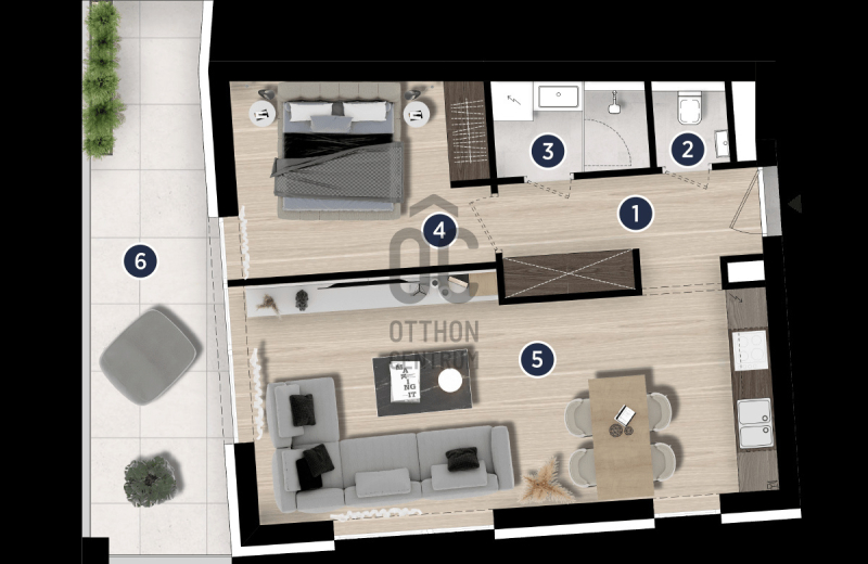 A liftes, modern épületek földszintjén és az első emeleten 4-4 db 48 m2-es, összkomfortos, fedett teraszos lakást, míg a második emeleten 2 db 68 m2-es penthouse-t kínálunk. A földszinti ingatlanokhoz élősövénnyel elválasztott privát udvar, a legfelső szinten pedig mindkét lakáshoz 68 m2-es, napvitorlával árnyékolt, vagy igény esetén végleges fedéssel ellátott tetőterasz, illetve jakuzzi tartozik. A leendő tulajdonosok egy teljesen gépesített, kompakt luxusotthont kapnak külön hálószobával, hasznos terekkel és fedett terasszal.