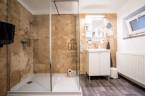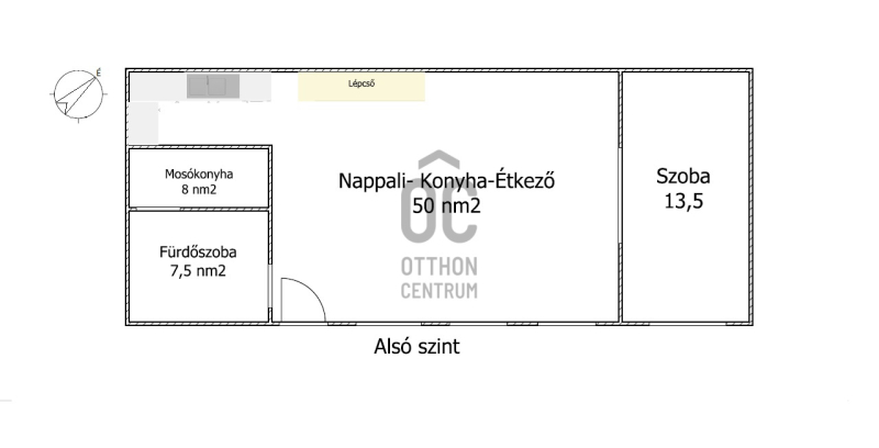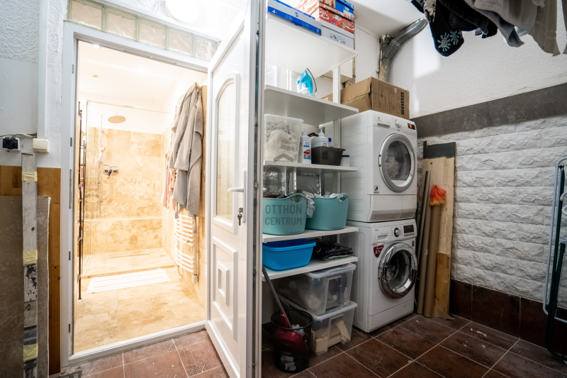 Az alsó szinten kapott helyet a nappali-konyha-étkező, 1 hálószoba, kamra, zuhanyzós fürdőszoba és egy tágas mosókonyha