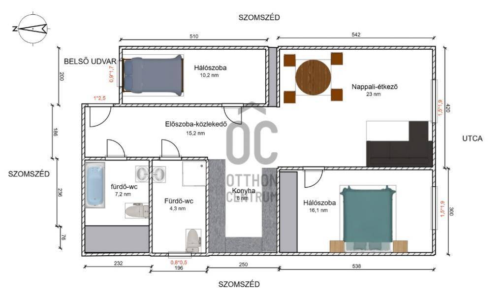 Két hálószoba: 16 m² (utcai), 11 m² (udvari)