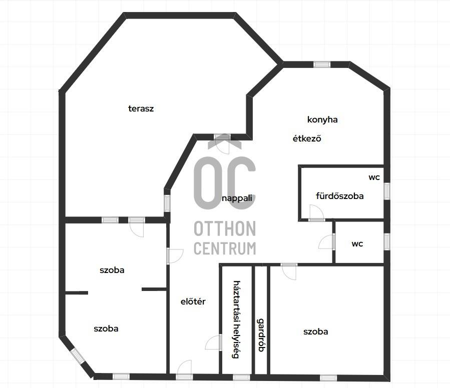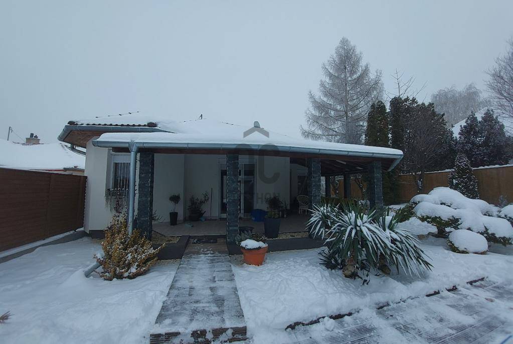 A kiváló állapotú lakóépület különleges, barátságos megjelenését a sokszögű kialakítás, az óriási fedett terasz és a nagyméretű nyílászárók teszik.