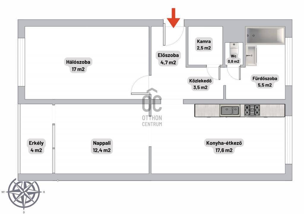 ️ Jelenlegi felosztása: előszoba, közlekedő, konyha-étkező, nappali, hálószoba, tároló/gardrób, fürdőszoba, wc.