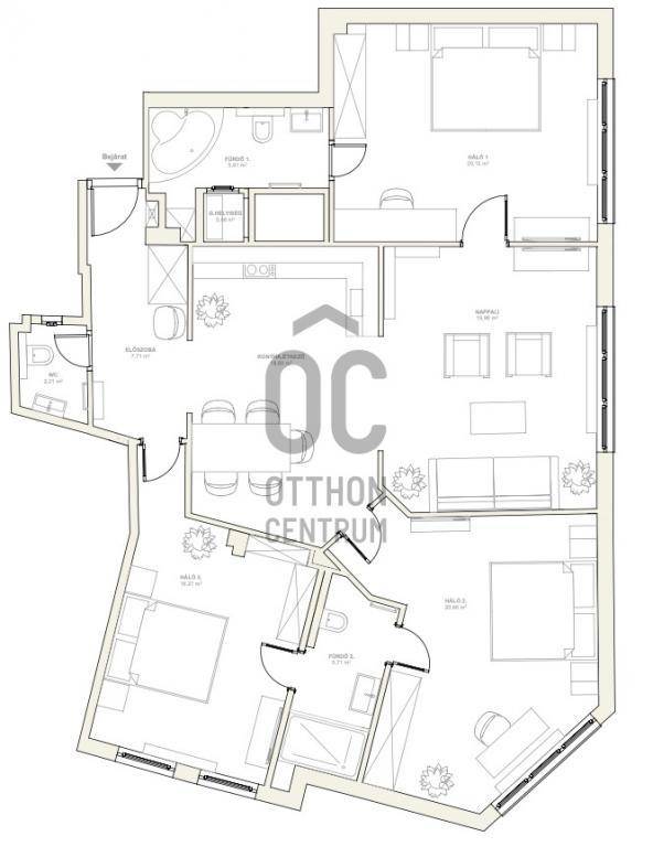 Elrendezés: nappali + 3 hálószoba, 2 fürdőszoba, vendég-WC.