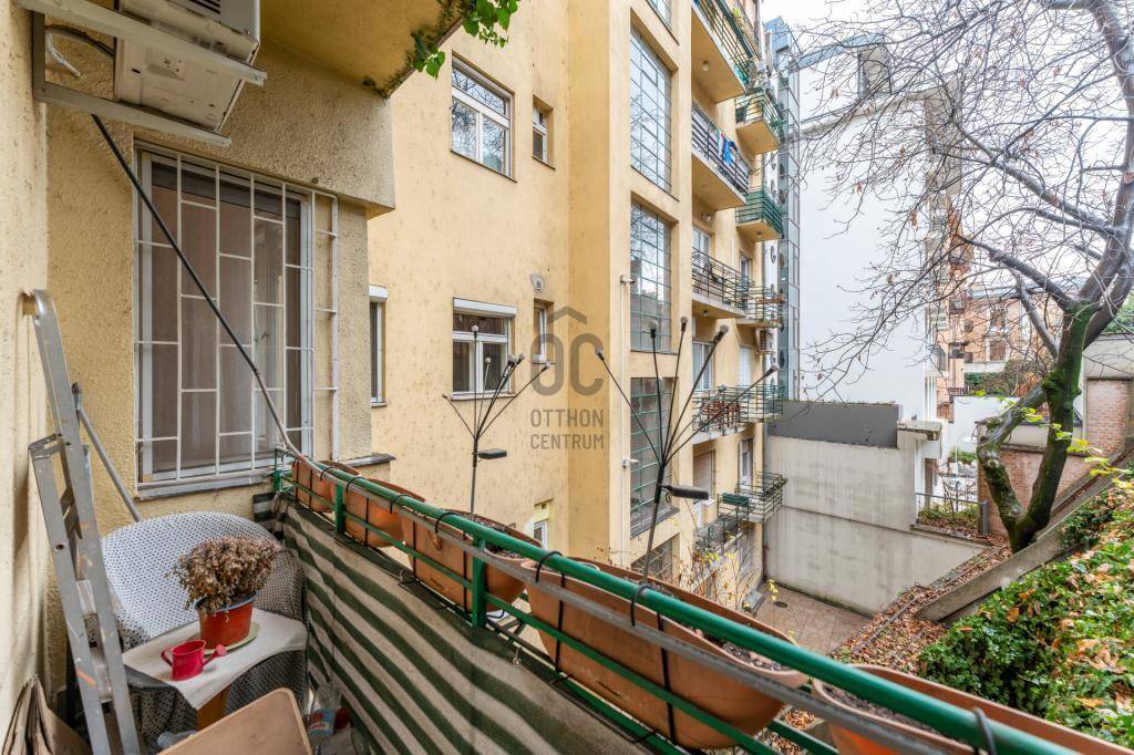 Az ingatlan egy 1935-ben épült, Bauhaus stílusú, liftes társasház 2. emeletén található. A 90 m²-es, 300 cm belmagasságú lakás teljes körűen felújított lakás nyugati tájolásának köszönhetően rendkívül világos és napfényes, erkélyéről lenyűgöző kilátás nyílik a Budai Várra. A környék kiváló közlekedési infrastruktúrával rendelkezik: a 19-es és 41-es villamos megállója, valamint a 16-os, 216-os és 105-ös buszok megállója néhány perces sétával elérhető a Clark Ádám térről.