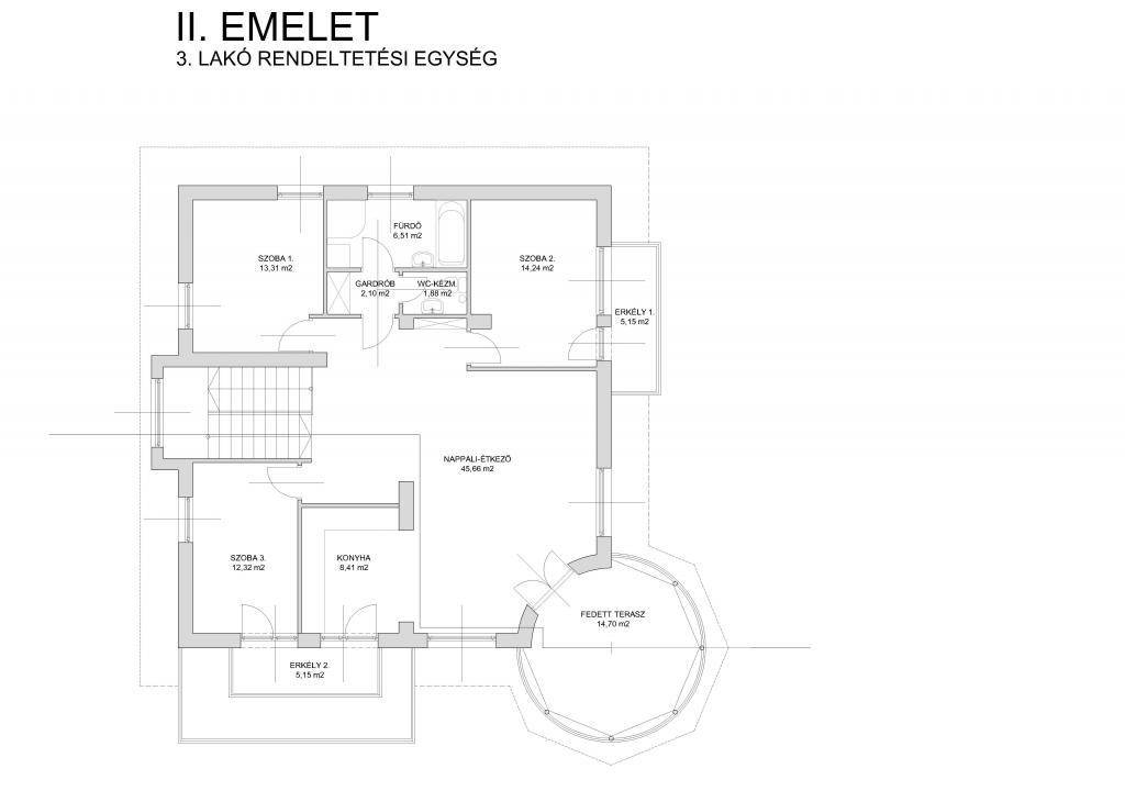 ERKÉLYEK: Az utcafrontra néző hálószoba 5,12 m2-es erkélykapcsolatos, a nappaliból 17,61 m2-es fedett terasz nyílik, és oldalt a legnagyobb hálószobából szintén egy 5,14 m2-es erkély nyílik.