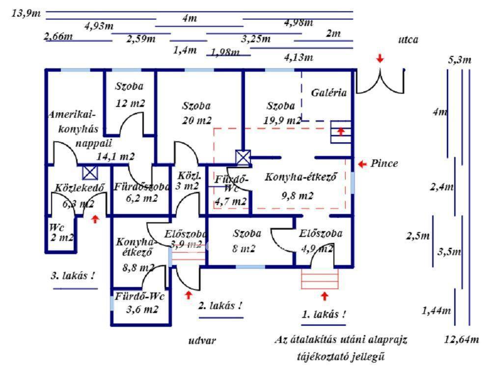 Bács-Kiskun vármegye, Kecskemét, Belvárosban 127 m2 hasznos alapterületű családi ház 342 m2 telken eladó. Az ingatlan a város központjában, csendes aszfaltozott utcában található. A családi ház jelenleg három külön bejáratú, két önálló lakórészből áll. Az első 47,3 m2-es lakrészben két szoba, egy galéria, egy konyha-étkező, egy fürdőszoba-WC-helyiség és egy előszoba található. A második 80 m2-es lakrész két szobából, egy konyhából, egy fürdőszoba-WC-ből, három közlekedőből, egy előszobából és egy különálló WC-helyiségből áll. Az ingatlanhoz tartozik még egy több egységből álló, tárolásra alkalmas melléképület. A tégla falazatú összkomfortos nagypolgári ház az 1900-as évek közepén épült, stukatoros fa födémmel, fa tetőszerkezettel, valamint égetett cserép héjazattal készült. Nyílászárói részben normál állapotú fa, illetve újracserélt műanyagból készültek, a belső nyílászárók egy része felújításra szorul. Az épület homlokzata kiváló állapotú, felújított. A háznak két falazott és három szerelt kéménye van, melyből több kémény is gáz-béléscsővel rendelkezik. A helyiségek járólappal, laminált padlóval, parkettával, hajópadlóval, PVC-vel, valamint padlószőnyeggel burkoltak. A konyhák és a fürdő-WC helyiségek felújításon estek át. Az otthon melegét és melegvíz ellátását lakrészenként víz-átfolyós gázbojler, a fűtést gázkonvektor és gázkazán biztosítja radiátoros hőleadással, emellett vegyestüzelésű bekötési lehetőség is rendelkezésre áll. Az ingatlan összközműves: lakrészenként a vezetékes víz, szennyvíz csatorna, egyfázisú villany és gáz az épületen belül rendelkezésre áll. Mérőórák szerint a villany és a gáz lakásonként külön mérhető. Az udvar részben parkosított, körben bekerített, gépjárművek beállására kapubejáró biztosított. A családi ház kialakítása miatt ideális lehet többgenerációs lakhatásra, három külön bejáratú lakás bérbe adására, 7 egységből álló rendelővé, irodává, egyéb szolgáltatóházzá való átalakításra egyaránt. Az udvari mellékhelyiségek lebontásával 5 gépjármű parkolása is megoldhatóvá válik. A vásárlás finanszírozásában az OTP kedvezőbb kamatozású hitelkonstrukcióival, CSOK Plusz lehetőségével tudunk segíteni. Az adásvételi szerződés lebonyolításához korrekt ügyvédi közreműködést tudunk ajánlani. Amennyiben felkeltettem érdeklődését, hívjon bizalommal! Eladó ingatlanokat keresünk hazai, illetve külföldi partnereink számára.