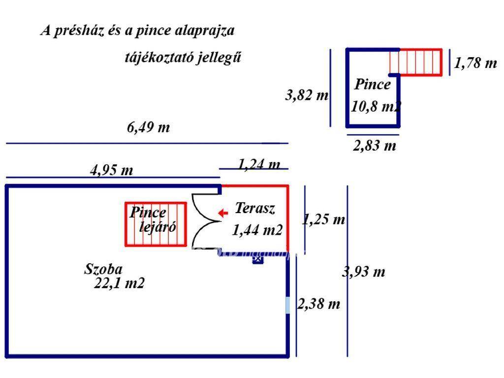 A különálló épületben található 22 m2 présházban az épületből megközelíthető 10,8 m2 nagyságú pince található. A présház saját egyfázisú áram-bekötéssel rendelkezik (1x16 A).