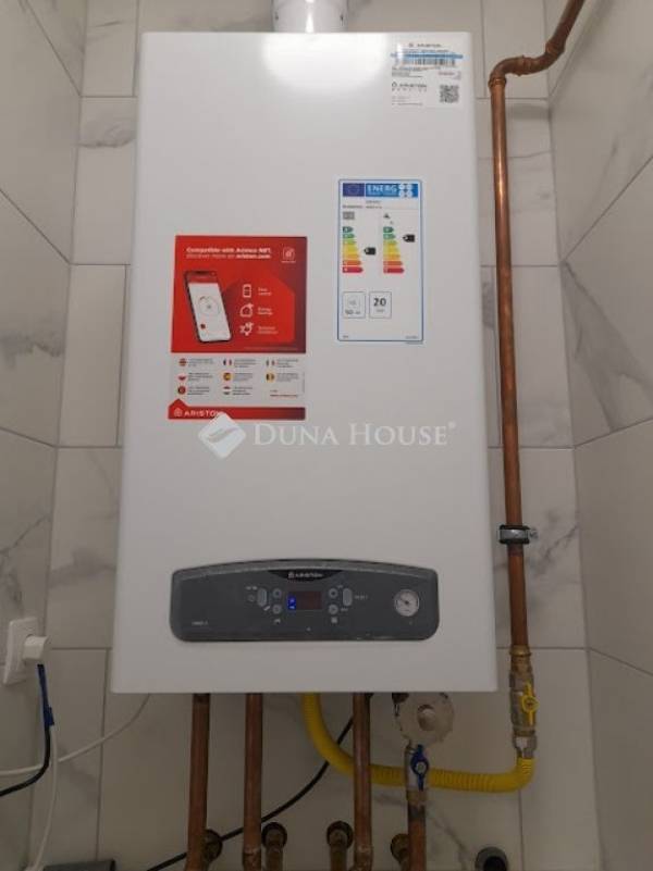 A családi ház melegvízellátásáról, fűtéséről modern kombi gázkazán gondoskodik radiátoros hőleadással.