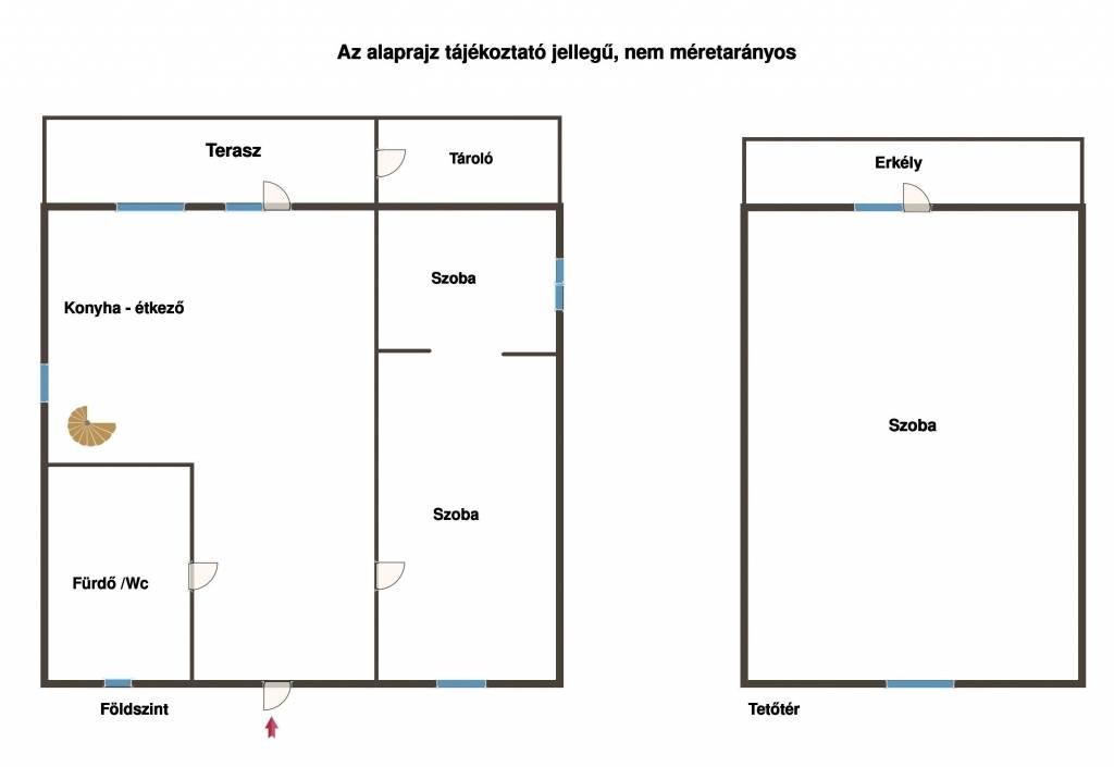 tetőtérben: csigalépcsőn megközelíthető, tágas szoba