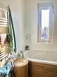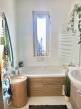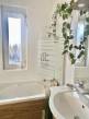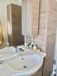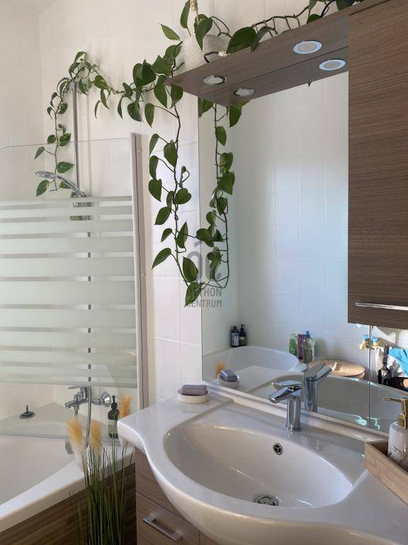 A fürdőszoba jól megtervezett, és minden szükséges kényelmet biztosít.