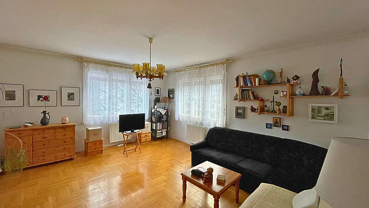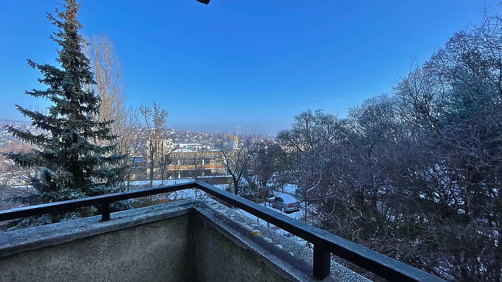 Istenhegyen, zöldövezeti környezetben, nagyméretű telken fekvő, karbantartott társasházban, emeleti, erkélyes, PANORÁMÁS lakás.