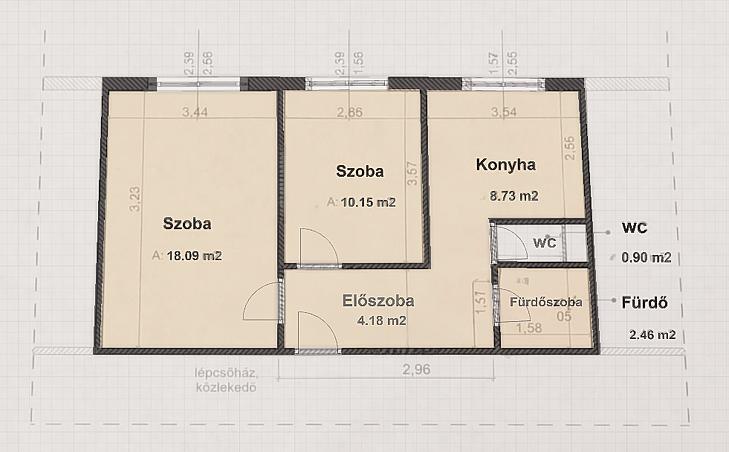 2 szoba, konyha, kádas fürdőszoba, mellékhelyiség, előszoba.