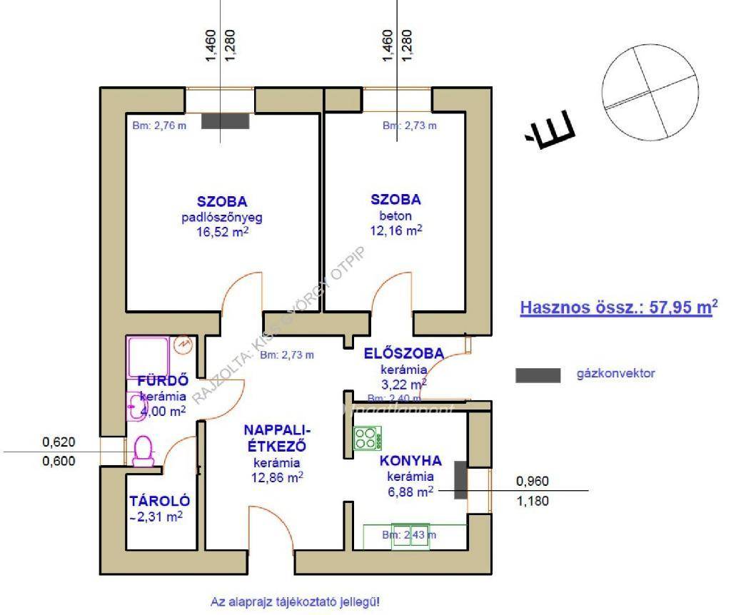 Helyiségek: 2 szoba, konyha, nappali-étkező, fürdőszoba (WC-vel egyben), tároló, előszoba.