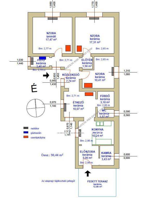 Helyiségek: konyha, étkező, 2 szoba, 1 félszoba, fürdő (kád jelenleg nincs, egyébként összkomfortos lenne), WC (fürdőből nyílik, de külön van), közlekedő, előszoba, előtér, kamra, fűtőhelyiség.