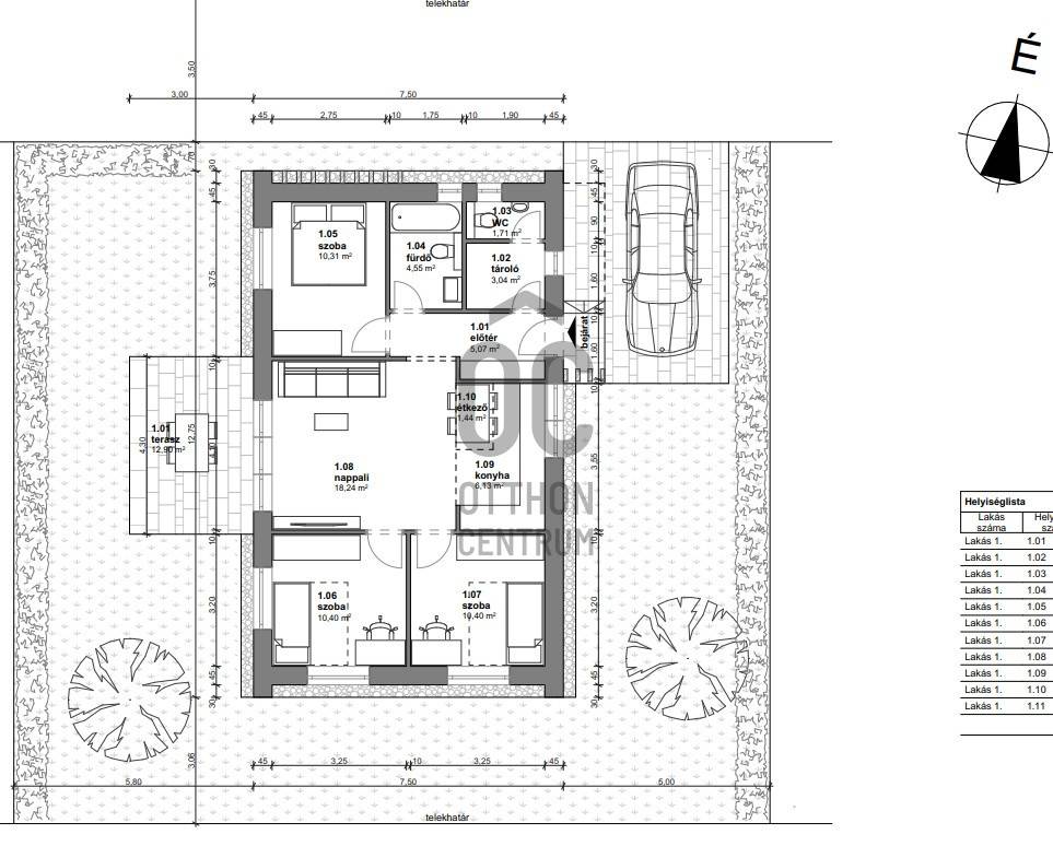 Nappali–amerikai konyha, 2–3 hálószoba, fürdőszoba, külön WC, terasz.
