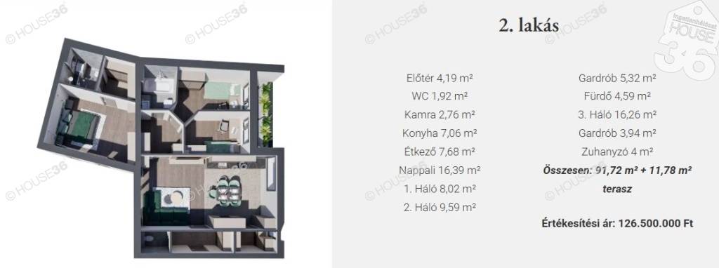 2-es lakás 91,72 m2 + 11,78 m2 terasz, nappali + 3 szoba, dupla fürdő, gardrób.