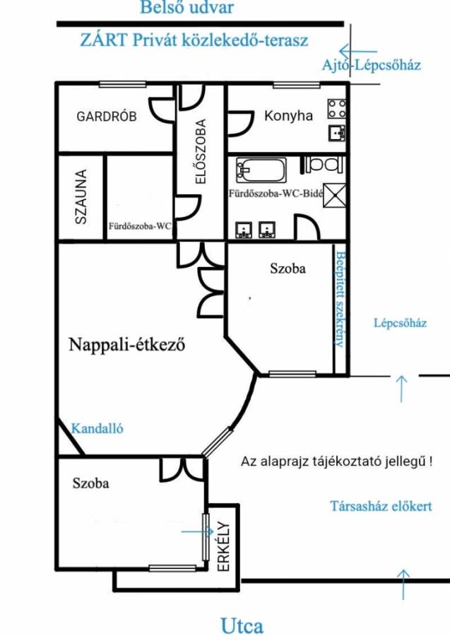 A lépcsőházból Zárható ajtón keresztül érkezünk a lakás előtt végighúzódó privát és nyitott közlekedőre, mely teraszként is funkcionálhat.