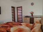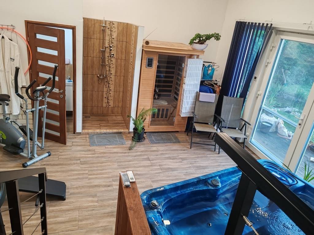 Elrendezése; szuterén szinten: 20 m2 –es garázs (melynek lejáratánál eső és hőmérséklet szenzoros padlófűtés került kiépítésre), tároló, wc, gépház lett kialakítva. A földszinti lakótéren; előtér, 29.85 m2-es nappali, 28.32 m2-es konyha, 12.69 m2-es étkező (kerti tóra panorámás 26.52 m2-es terasszal), kamra, 2 db fürdőszoba, gardrób és 4 db szoba található. Hangulatos átjáró vezet át a 22.92 m2-es wellnes épületbe, melynek mennyezete csillagos égbolttal rendelkezik. A helyiség egy légterű, melyben beépítésre került egy wc, egy esőztetős zuhanyzó, egy 4 személyes (bluetooth-os, két motoros) jakuzzi és egy infraszauna. Az épülethez közvetlen kapcsolatú napozóterasz tartozik.