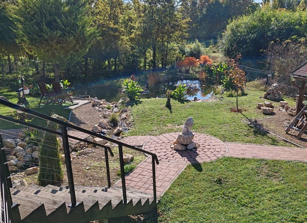 Az ingatlanhoz 1135 m2-es körbekerített, minden évszaknak megfelelően rendezett, parkosított telek tartozik, melyen hangulatos kerti tó, patak, kiülő, sütögető, grill szaletli található. Az ingatlan utcafront felőli oldalán lemez garázs biztosítja a plusz parkolási lehetőséget. Mindkét garázskapu elektromos, melyek telefonról, távirányítóról vezérelhetőek. Az ingatlanra több minden irányba figyelő éjjel látó kamera van felszerelve.
