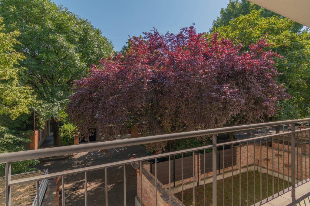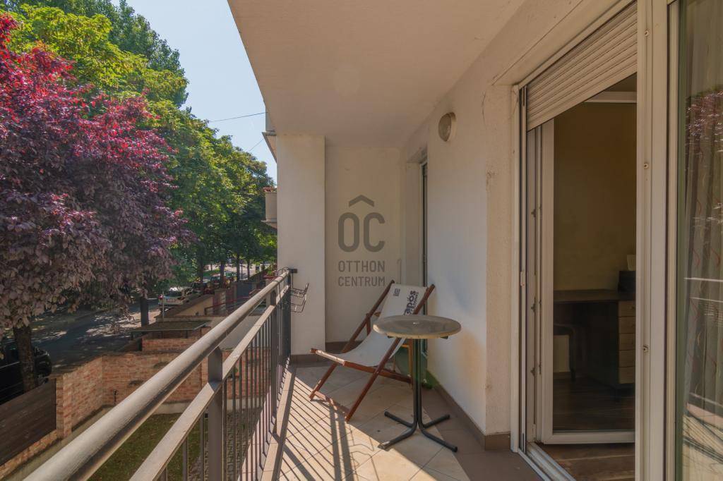 A nappaliból és a hálószobából is ki tudunk menni a zöld fákkal körül ölelt erkélyre.