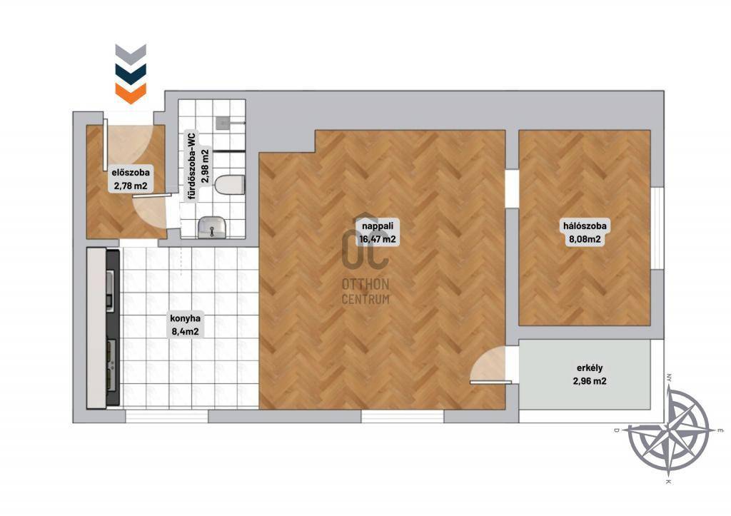 * Elosztása: előszoba, amerikai konyhás nappali és étkező erkély kapcsolattal, hálószoba, zuhanyzós fürdőszoba - WC.